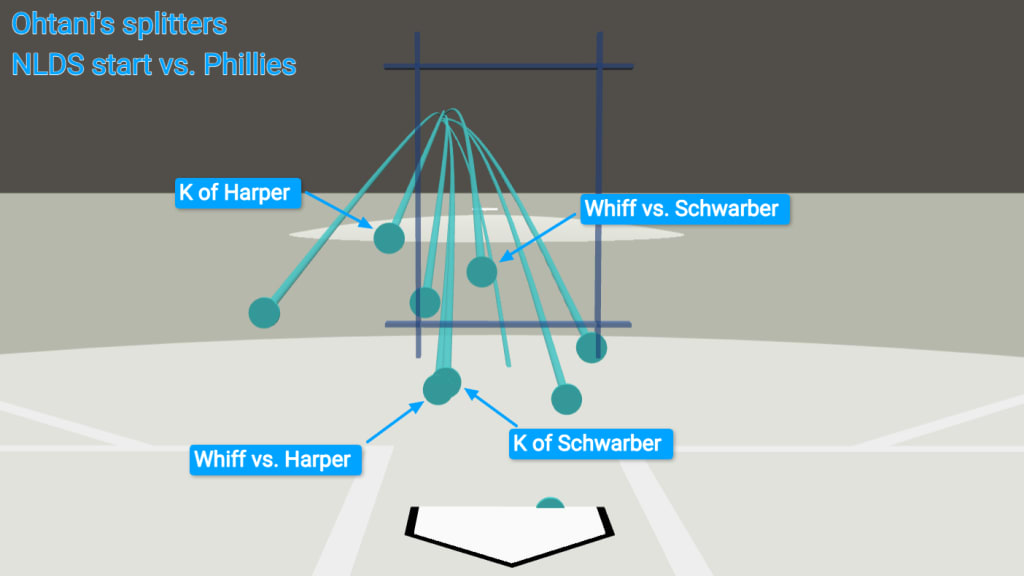 La clave fue que, al intensificarse en un juego de postemporada, el comando de su splitter reapareció. Los splitters de Ohtani frente a los Filis se agruparon en la parte baja de la zona de strike, lo suficientemente cerca para provocar swings, que terminaban en blanco gracias al quiebre tan marcado del lanzamiento.