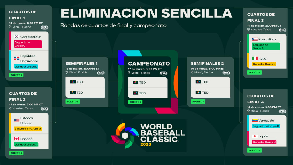 Ocho equipos, dos de cada grupo, siguen en la lucha por el título del Clásico Mundial de Béisbol, ya que el evento adopta un formato de muerte súbita. Los cuartos de final empezarán con dos partidos el viernes, seguidos por dos más el sábado.